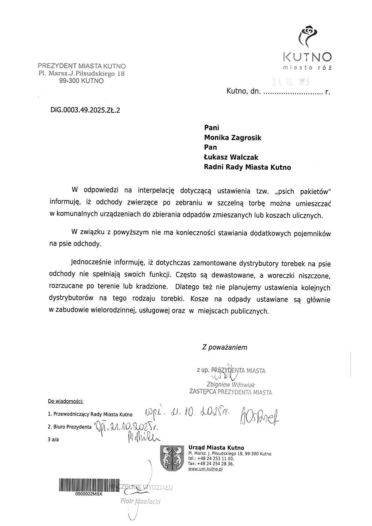 Interpelacja Radnych RM p.Moniki Zagrosik i p.Łukasza Walczaka z dnia 14.10.2025 r. dotycząca ustawienia tzw. "psich pakietów" na terenie wskazanych lokalizacji.